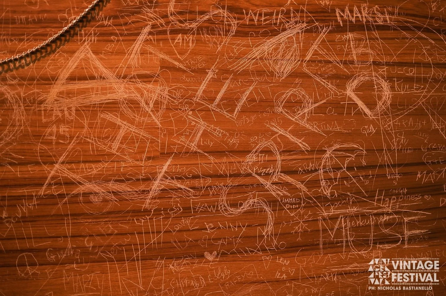 L'ispirazione, in questo caso, si è rivelata di semplicità disarmante, estrosa, agile e popolare, come confermato dall'autentico assalto lanciato all'installazione. Un parquet appeso a una parete e la possibilità con tre chiavi di incidere il proprio pensiero (frase, parola o simbolo). Interazione genuina, libera e divertente: la superficie disponibile si è esaurita prestissimo, a forza di messaggi di tutte le lunghezze e dimensioni, tanto che in breve i visitatori hanno iniziato a sfruttare anche gli angoli e i minuscoli rimasugli di spazio vuoto, fino a scrivere coprendo le incisioni precedenti con segni più profondi e insistiti.