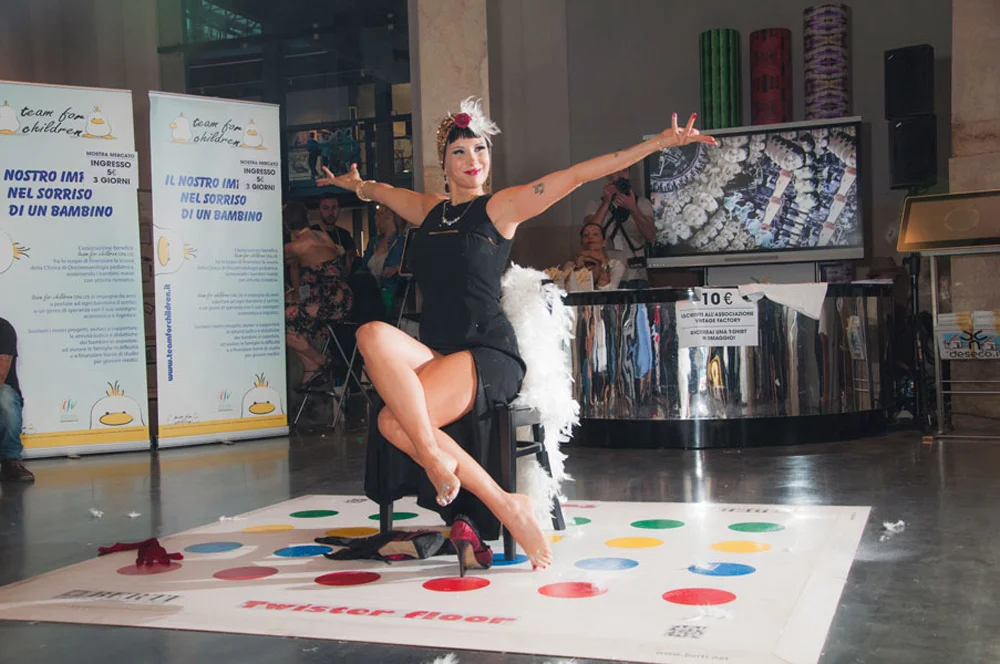 Ecco allora il nostro personalissimo Twister, il celebre gioco in scatola nato a metà anni ’60 negli Stati Uniti e divenuto famoso negli anni ’80 in Italia: una serie di pallini colorati su un telo costringono a esilaranti contorsioni per raggiungere una data posizione. Lo riproponiamo in versione parquet. La sfida è lanciata a tutti i visitatori e la partecipazione si rivelerà sorprendente.