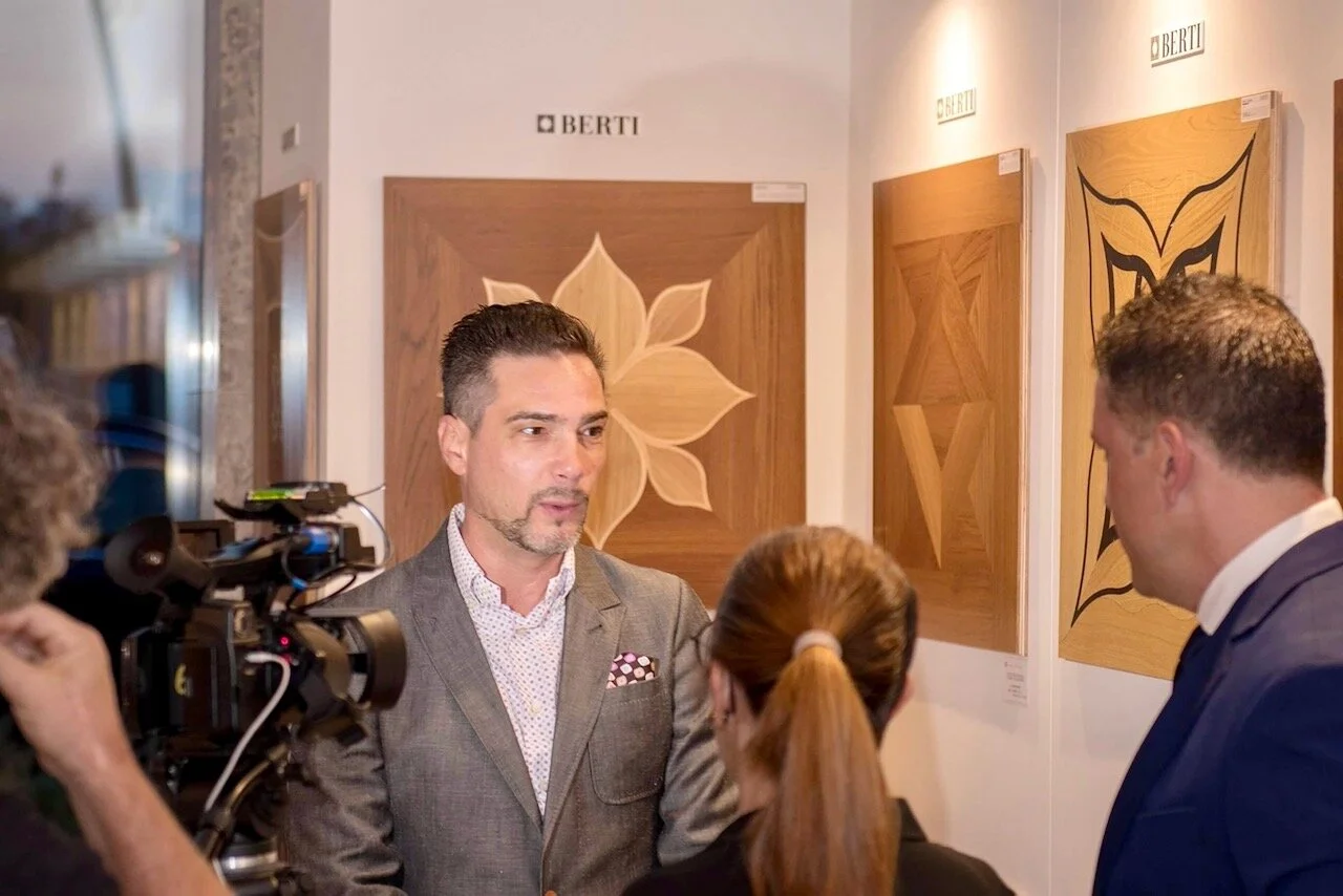 La bella figura era d'obbligo, specialmente considerando che il padrone d casa presentava la nuova “Porta Venere”, impreziosita da oltre 30mila cristalli Swarovski di diversi colori. Anche per Berti, e per me, si presentava l'occasione di sfoggiare l'attitudine alle lavorazioni di lusso e qualità. Riuscii a collocare, proprio a fianco della Porta Venere, lo spettacolare intarsio realizzato In Wave, una combinazione creata con pavimento prefinito e la tecnologia del laser. Una presenza all'altezza, che suscitò interesse e ammirazione da parte degli invitati.